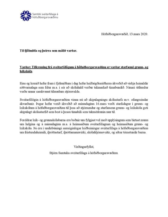Í henni kemur fram að næsti mánudagur, 16.mars, verður skipulagsdagur í leik- og grunnskólum á öllu höfuðborgarsvæðinu. Hann munu skólar nýta til að undirbúa skólahald næstu fjórar vikur með tilliti til þeirra takmarkana sem hafa verið settar.